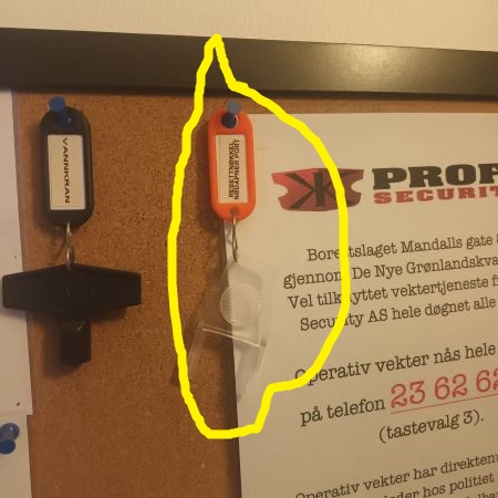 Alarmen/blinking nullstilles og porten laases ved at man setter inn noekkelen. Resettnoekler skal henge på tavlene i hver oppgang.