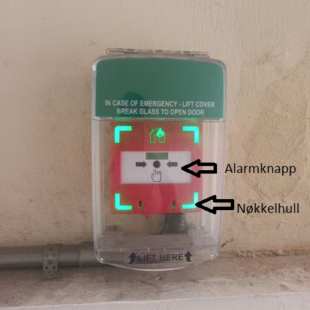 Brannalarmen i portrommet er "noedaapneren" til porten.